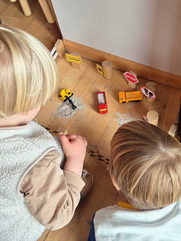 Alles begann vor einigen Nächten, als eine Baustelle im Gruppenraum der Kleinen Römer auftauchte. Niemand wusste zunächst, was es damit auf sich hatte, doch als am nächsten Morgen die Kinder wieder im Haus waren, war die Baustelle verschwunden. An ihrer Stelle fand sich eine kleine Tür – umgeben von einem hübschen Zaun und allerlei Zubehör, das die Fantasie beflügelte. Ein klarer Hinweis, dass hier etwas Magisches vor sich ging!