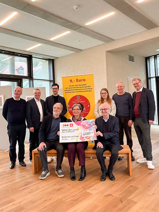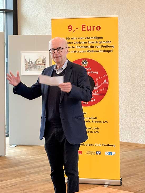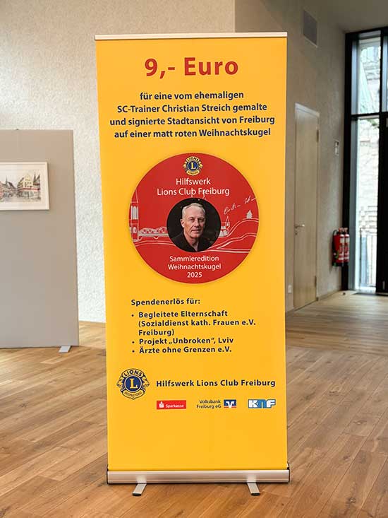 Zahlreiche Gäste füllten gestern das Münsterforum über dem Café inklusiv des Caritasverbandes Freiburg-Stadt e. V. Anlass war die Weihnachtskugelaktion des Hilfswerks Lions Club Freiburg. Bei der Aktion konnte zur Weihnachtszeit eine vom ehemaligen SC-Trainer Christian Streich gestaltete und signierte Weihnachtskugel erworben werden. Was als kreative Idee begann, wurde zu einer starken Gemeinschaftsaktion. Der Erlös kommt verschiedenen sozialen Projekte zugute: Ärzte ohne Grenzen e.V., der Sozialdienst katholischer Frauen e. V. Freiburg, sowie das Projekt „Unbroken“ in Lviv freuen sich über eine großzügige Spende.